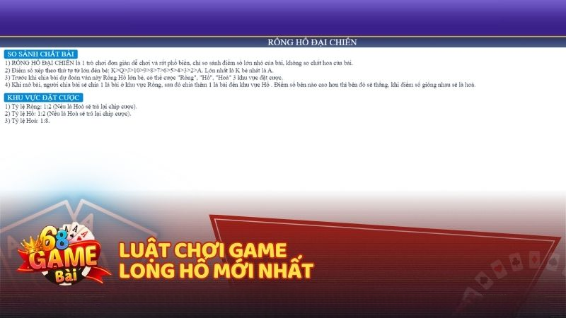 Long Hổ (Dragon Tiger) là một trò chơi bài vô cùng phổ biến tại các sòng bạc trực tuyến nhờ vào tính đơn giản và tốc độ trận đấu cực kỳ nhanh. Bắt nguồn từ Campuchia, trò chơi này đã nhanh chóng lan rộng và trở thành cái tên quen thuộc tại các thị trường cá cược toàn cầu. Với luật chơi dễ hiểu, chỉ cần một vài thao tác đặt cược, người chơi đã có thể tham gia và nhận ngay kết quả. Chính sự nhanh gọn, hấp dẫn này đã giúp Long Hổ trở thành một bàn cược không thể thiếu tại Live Casino của 68 Game Bài.